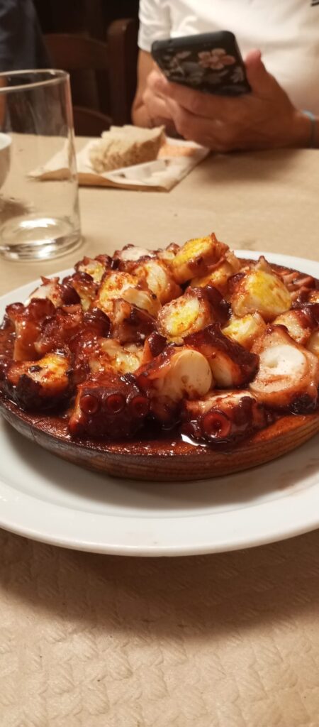 Fuimos entonces al lugar indicado: zamburiñas, pulpo a la gallega, vino tinto… y un festín de risas y fotos. Aquella cena se convirtió en una de las mejores del Camino.